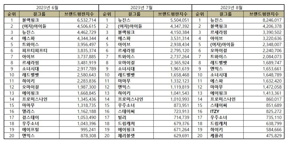 그 결과, 뉴진스가 참여지수 1,301,860, 미디어지수 2,019,755, 소통지수 1,888,376, 커뮤니티지수 3,036,026으로 브랜드평판지수 8,246,017로 분석되어 1위를 차지하게 되었습니다.